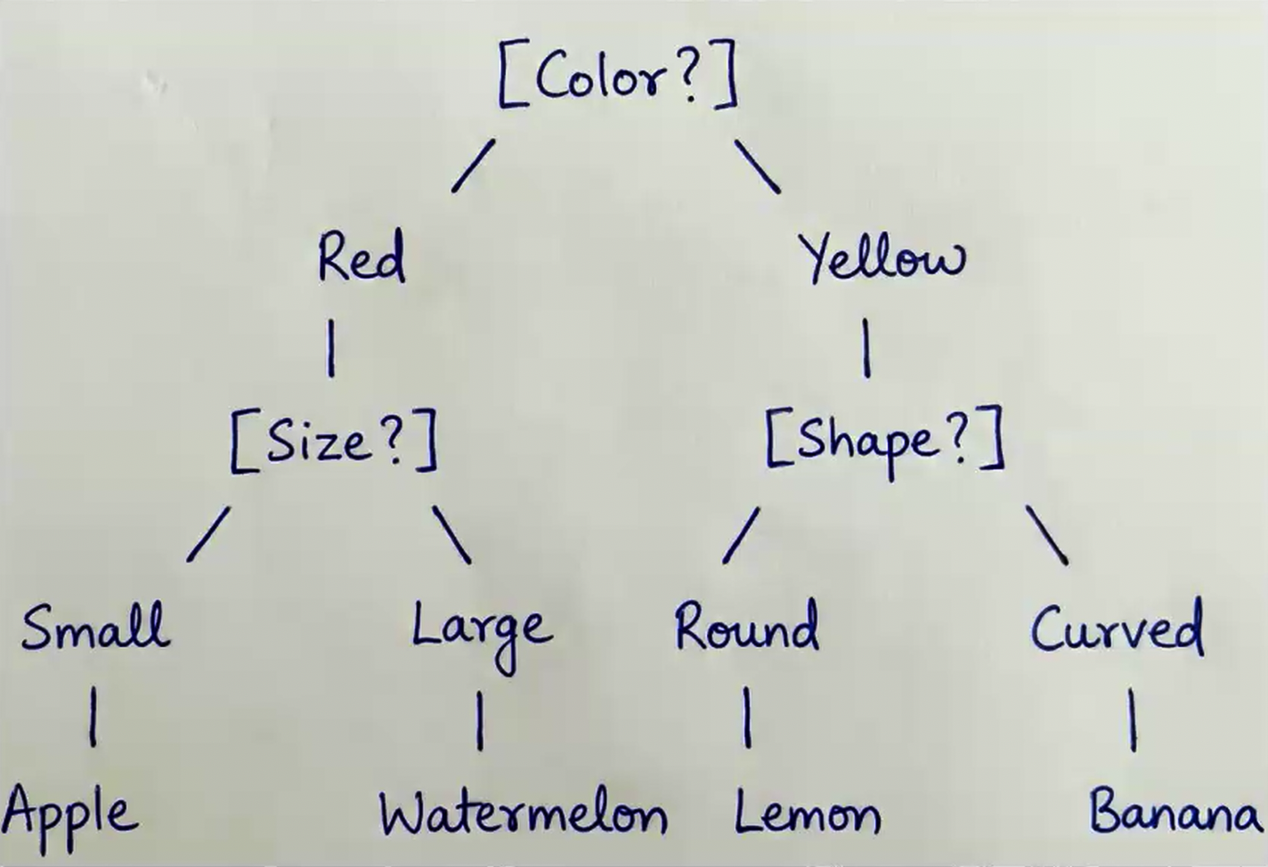 Q2. You have asked your students to design a decision tree to classify different fruits based on three characteristics: color, size, and shape. To check whether the following proposed solution is correct, you are going to test it with a small, round, yellow apple.